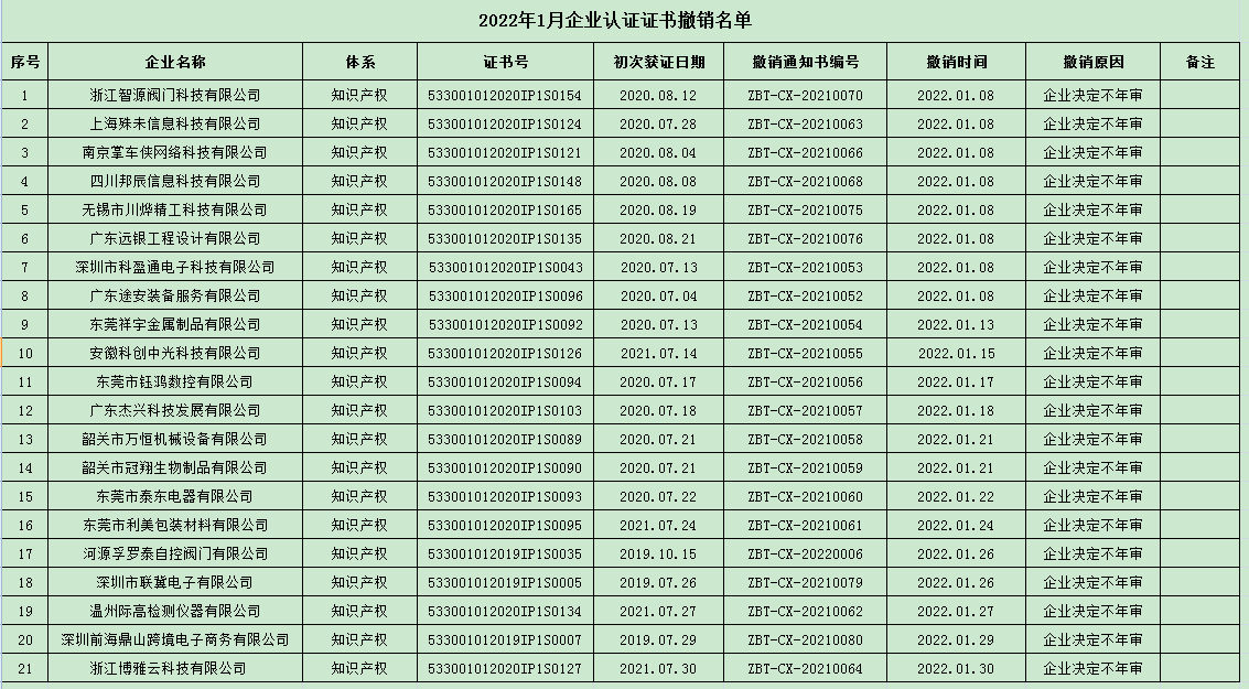通知 2022年1月企業(yè)認(rèn)證證書撤銷名單