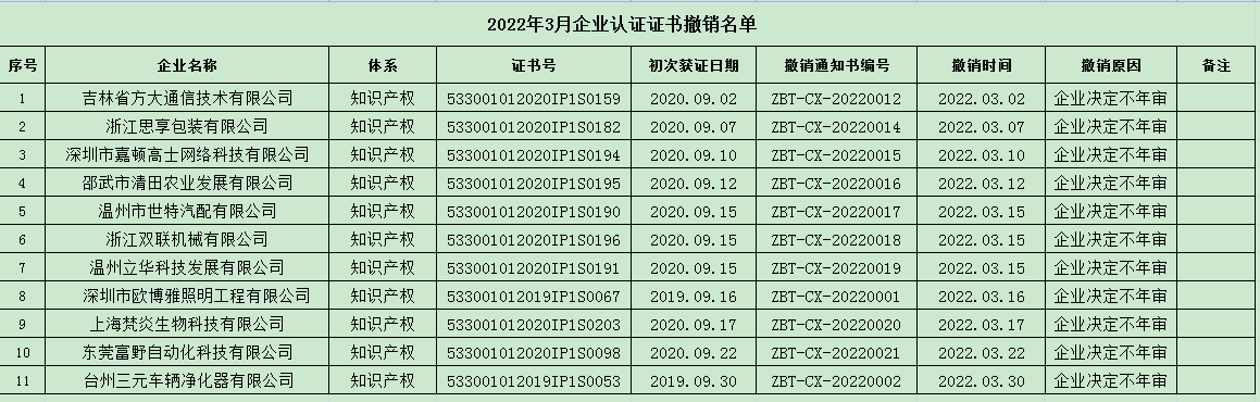 通知 2022年3月企業(yè)認(rèn)證證書撤銷名單