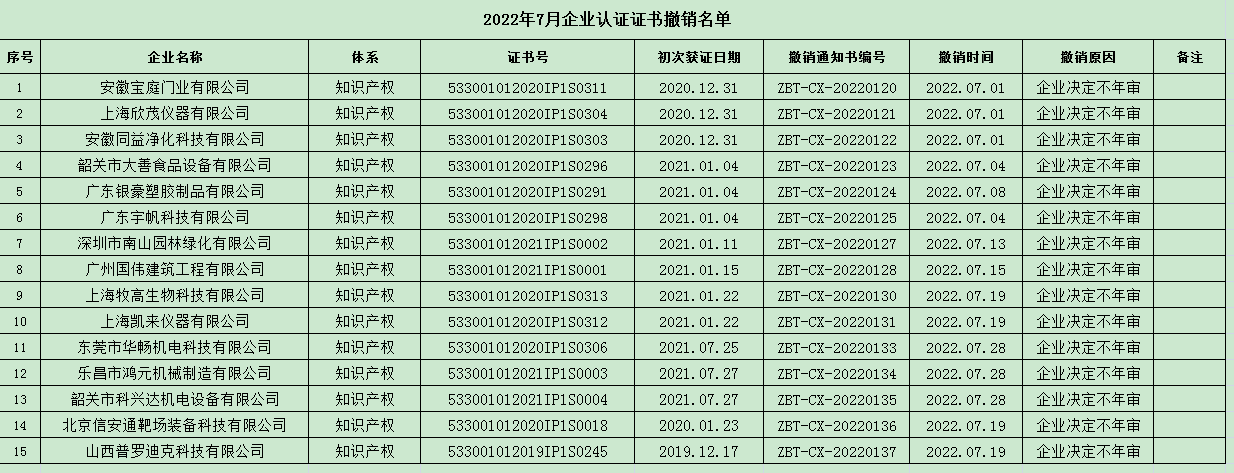 通知 2022年7月企業(yè)認證證書撤銷名單
