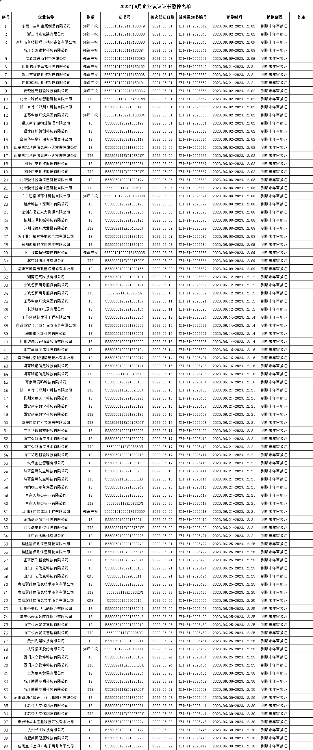 2023年06月企業(yè)認(rèn)證證書(shū)暫停名單